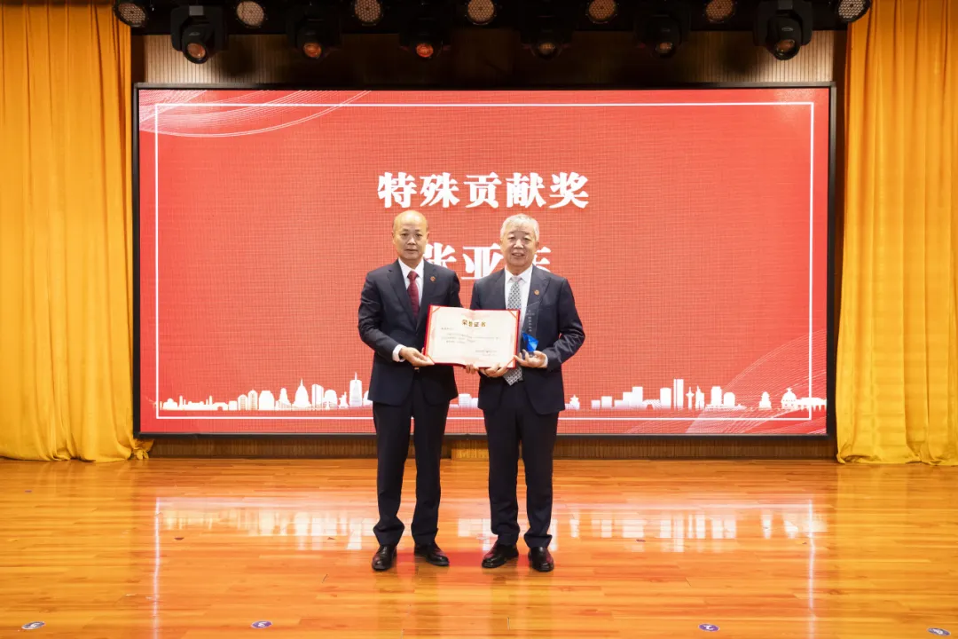 為表彰先進(jìn)典范、鼓舞團(tuán)隊(duì)士氣,此次會(huì)議舉辦了莊重的頒獎(jiǎng)儀式。董事長(zhǎng)陶保富向在學(xué)校發(fā)展工作中作出卓越貢獻(xiàn)的副校長(zhǎng)張亞?wèn)|教授授予“特殊貢獻(xiàn)獎(jiǎng)”,全場(chǎng)隨即報(bào)以熱烈掌聲。