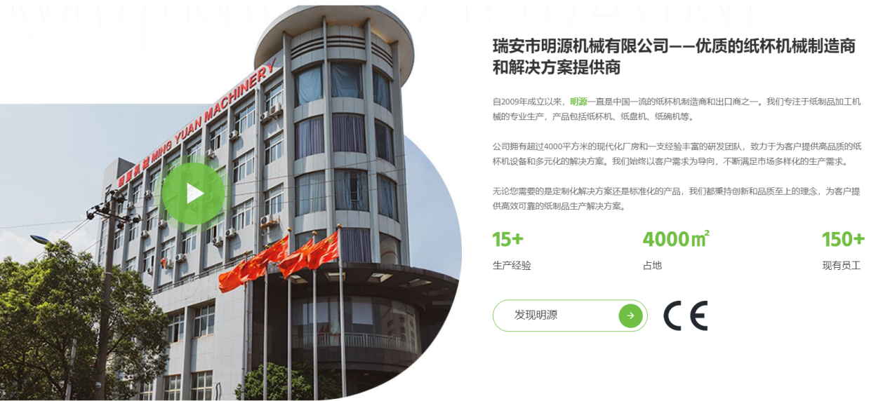 瑞安市明源機(jī)械有限公司是紙杯機(jī)、紙盤(pán)機(jī)、熱收縮膜機(jī)、紙碗機(jī)紙桶機(jī)、蛋糕托機(jī)、杯蓋機(jī)、漢堡盒機(jī)等產(chǎn)品生產(chǎn)加工的公司,所有產(chǎn)品由生產(chǎn)部統(tǒng)一協(xié)調(diào),實(shí)現(xiàn)高效優(yōu)質(zhì)一條龍全方位生產(chǎn)服務(wù),擁有多個(gè)車(chē)間,擁有完整、科學(xué)的質(zhì)量管理體系。公司秉承“質(zhì)量、服務(wù)、價(jià)格”的企業(yè)宗旨,目前擁有10多條生產(chǎn)線(xiàn),產(chǎn)品出口到67個(gè)國(guó)家。高質(zhì)量的成品幫助客戶(hù)贏得市場(chǎng)。我們將始終追求提高機(jī)器性能的目標(biāo),為客戶(hù)提供更及時(shí)的售后服務(wù)。