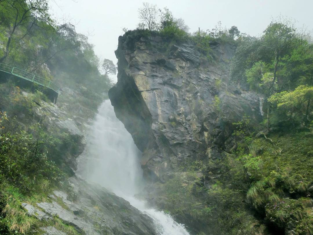 飛天瀑布落差約120米,呈4級(jí),或飄或綴或斷或掛傾瀉而下。瀑布口被凌空橫懸的大石壁遮住,猶如天門深不可測(cè),欲探源頭藏何處,錢江之水天上來(lái)。上端只見雨霧彌漫繚繞,下端有清可見底的水潭,潭周天然石階,可供游人坐立觀賞。