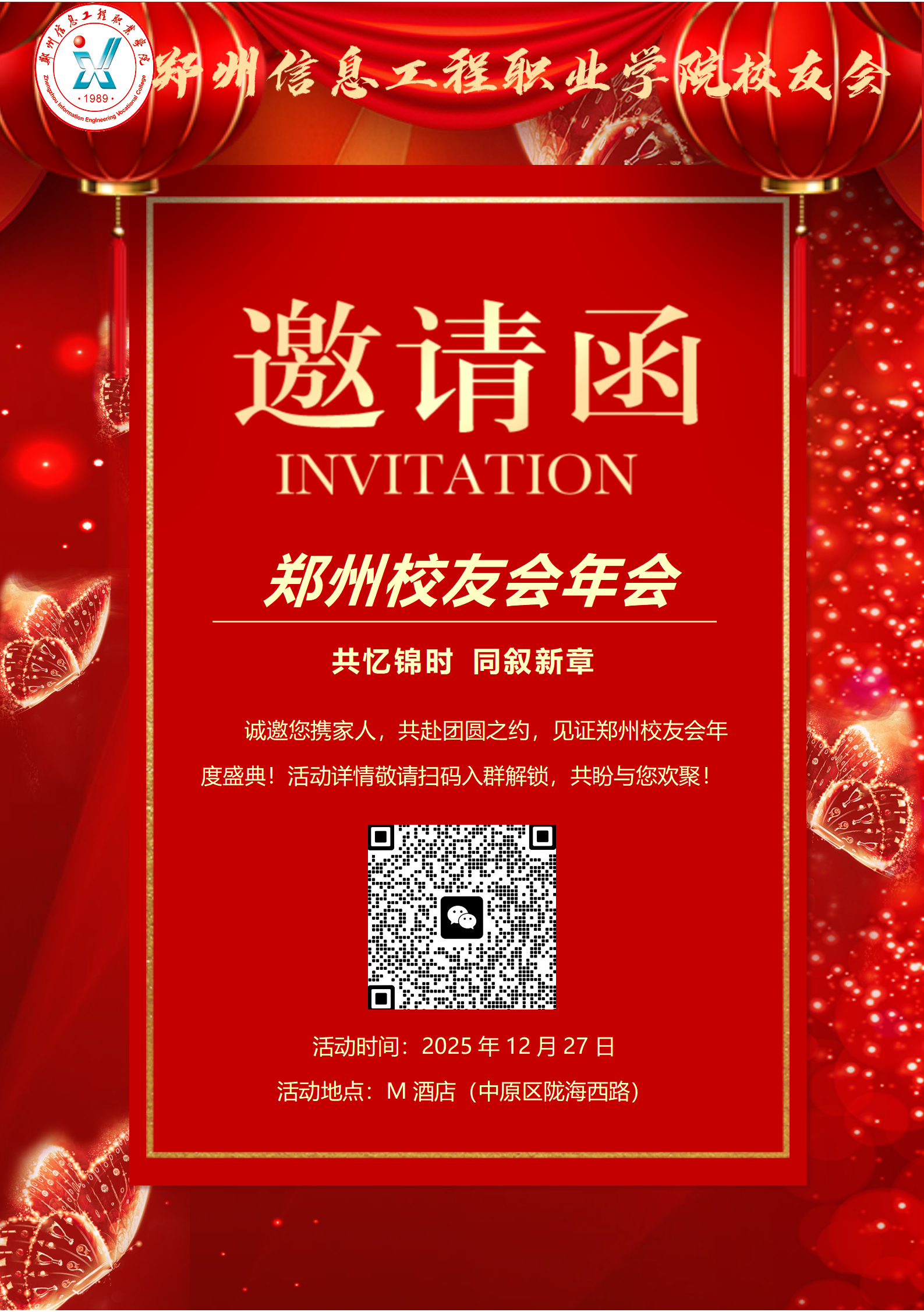 誠摯邀請您掃描上方二維碼,加入鄭州校友會年度盛會專屬群聊,靜候與您歡聚一堂,共敘同窗情誼!