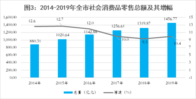 消費(fèi)市場(chǎng)運(yùn)行平穩(wěn)。全年社會(huì)消費(fèi)品零售總額1456.77億元,比上年增長(zhǎng)10.4 %。按經(jīng)營(yíng)地分,城鎮(zhèn)消費(fèi)品零售額1261.32億元,增長(zhǎng)10.2 %;鄉(xiāng)村消費(fèi)品零售額195.45億元,增長(zhǎng)11.6 %。