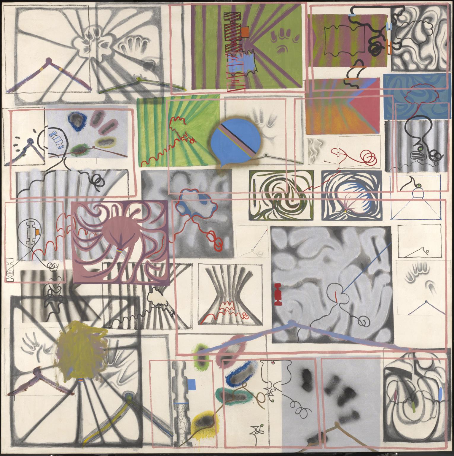 這幅畫由無數(shù)個(gè)“面板”組成。這種格式的一個(gè)來源是科恩免費(fèi)創(chuàng)作的圖紙,這些圖紙成組排列。另一個(gè)是他和許多藝術(shù)家可以顯示各種“發(fā)現(xiàn)”圖像的公告板。這些面板是用來容納各種圖像的容器,包括子宮或擠壓的膀胱,聚集的窗簾,頭部,并按照他的不斷實(shí)踐,科恩將每幅畫板想象成一幅離散的畫,一次完成一幅。像這里一樣,分割繪畫對(duì)科恩在未來幾年中將變得越來越重要。