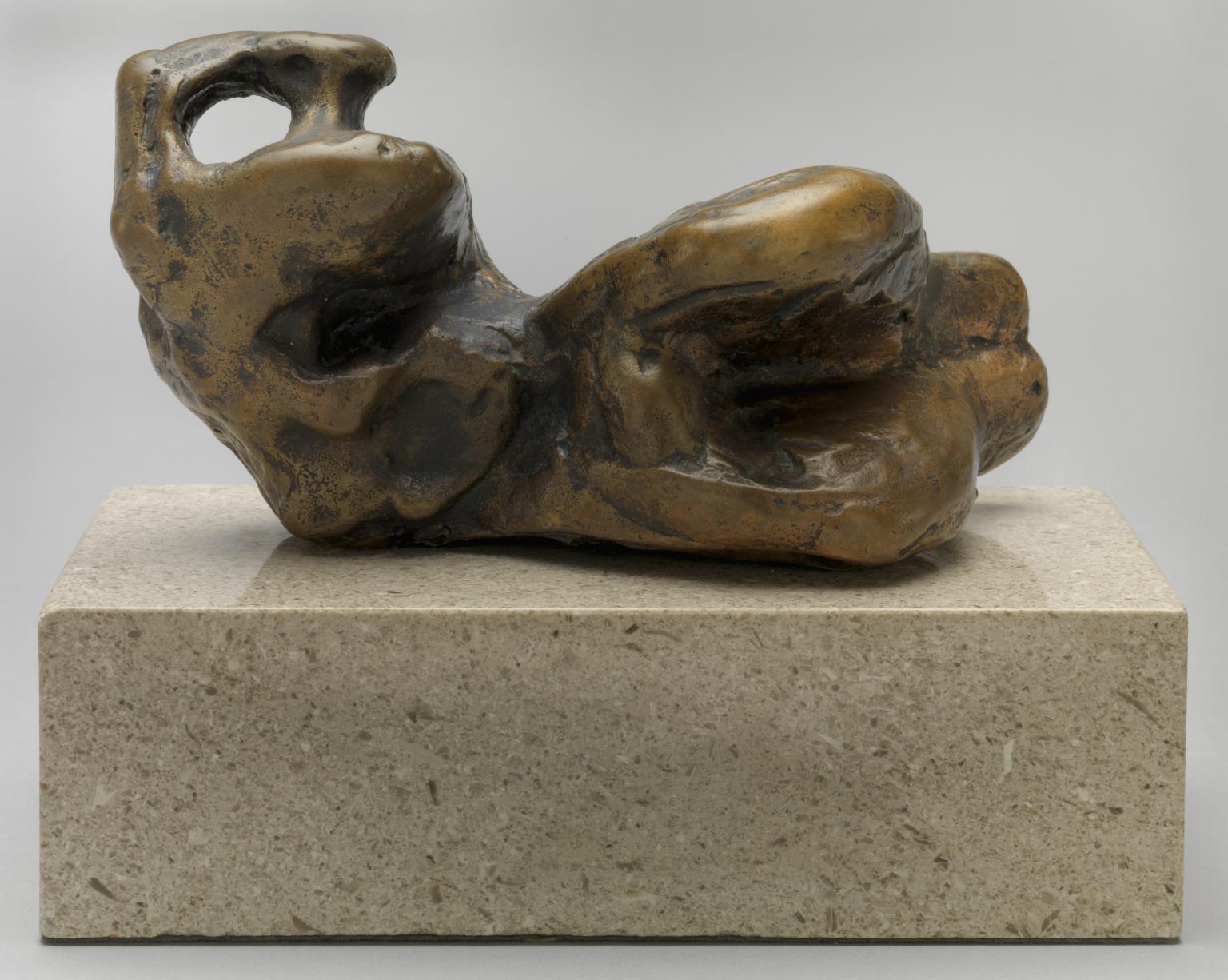 By the mid-1950s Moore had almost entirely eliminated drawing from his creative process and explored his ideas through small maquettes . These had an intrinsic quality of immediacy or spontaneity and allowed him to imagine the finished product in the round. In order to translate the scale of the work more effectively, he often made larger working models as an intermediate stage between the maquette and the finished sculpture . Moore’s maquettes were typically cast in bronze in editions of up to ten. The sculptor strove for monumentality in his work and tried to imbue the same quality in the small maquettes. He also took a great deal of care with their finish. Some were more polished than others, some darker, some greener. Moore did all the patination himself, treating the bronze with different acids to achieve different effects then working on it by hand, rubbing and wearing it down.