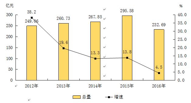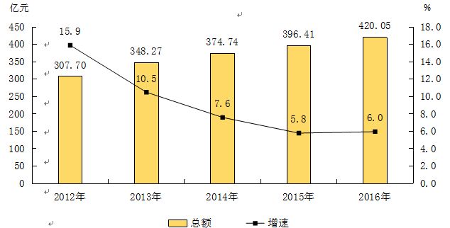 2012-2016 年社會(huì)消費(fèi)零售總額及增速