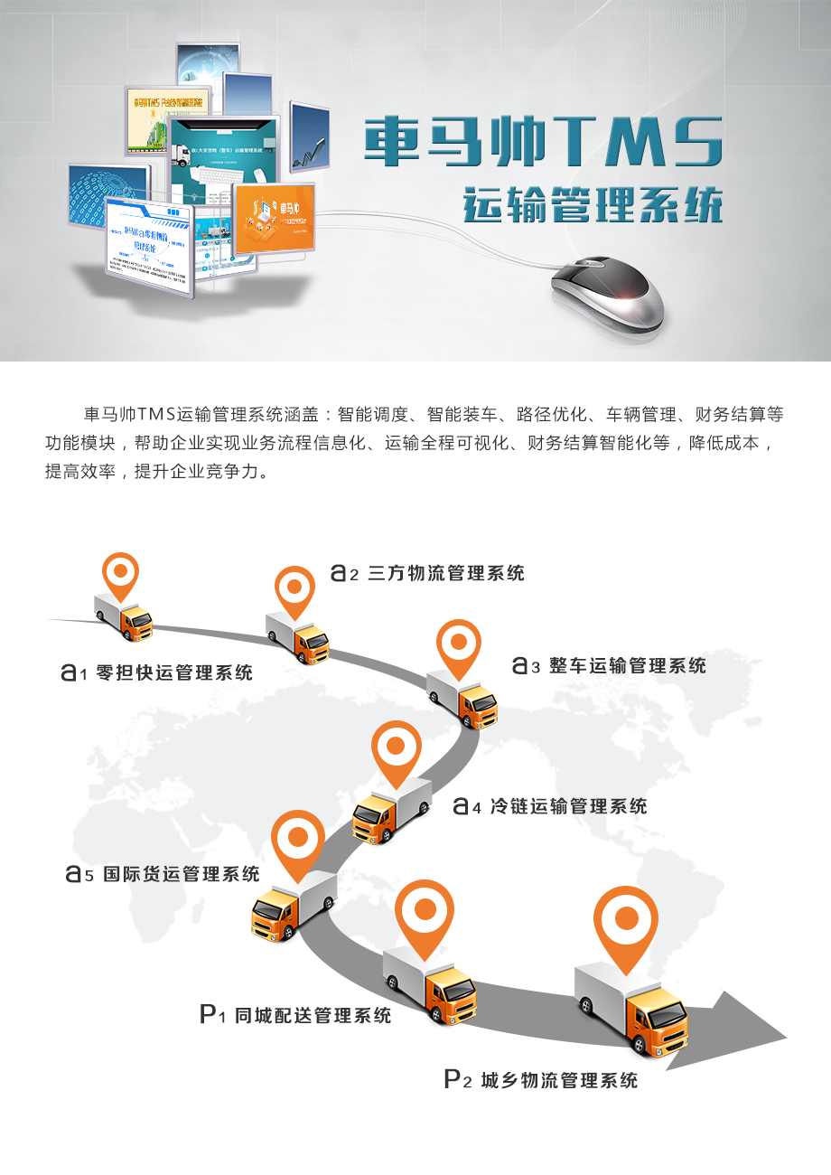 - 車馬帥TMS運(yùn)輸管理系統(tǒng)涵蓋:零擔(dān)專線運(yùn)輸管理系統(tǒng)、整車運(yùn)輸管理系統(tǒng)、同城配送管理系統(tǒng)、城鄉(xiāng)物流管理系統(tǒng)、無車承運(yùn)人管理系統(tǒng)等。