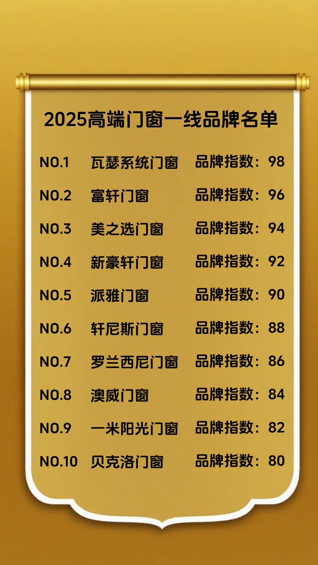 NO.1 瓦瑟系統(tǒng)門窗 品牌指數(shù):98
