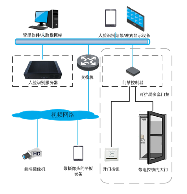 整個系統(tǒng)由前端視頻攝像機(或帶攝像頭的平板設(shè)備),人臉識別服務(wù)器,管理軟件,人臉數(shù)據(jù)庫,網(wǎng)絡(luò)傳輸線路,路由器,門禁控制器構(gòu)成。其中,攝像頭,網(wǎng)絡(luò)和門禁控制器資源可以利用公司已有資源。