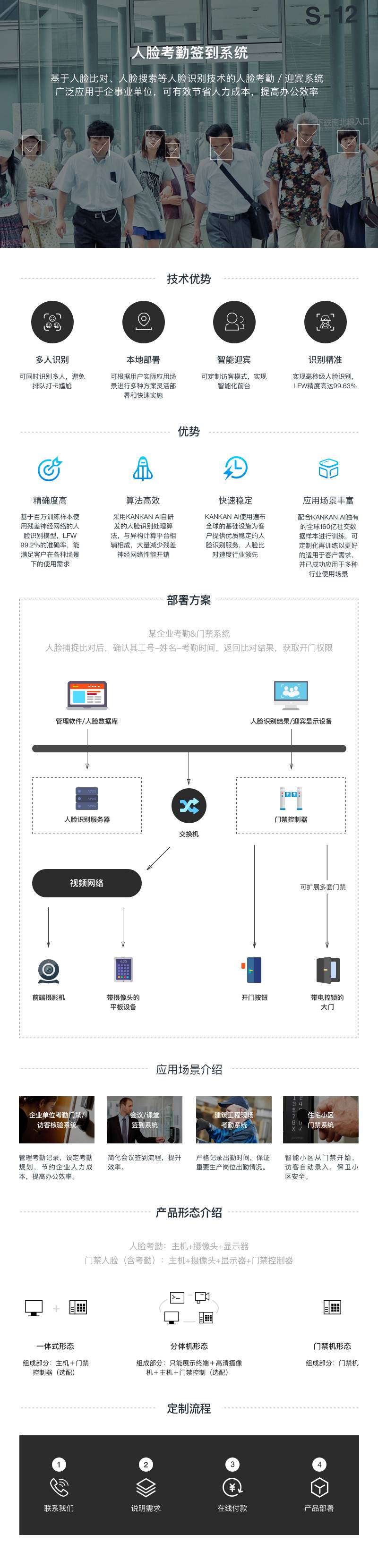 KANKAN AI人臉識別考勤門禁系統(tǒng)可廣泛應(yīng)用于大型工礦,企業(yè)單位,金融機構(gòu),學(xué)校,醫(yī)院,生活社區(qū),政府機關(guān)單位,軍隊、保密機構(gòu)特殊場所等各種場景的身份核驗及考勤、門禁、簽到、迎賓等應(yīng)用。